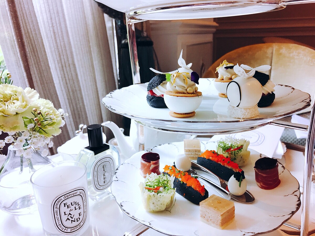 除上述小點之外,此套下午茶亦包含兩款傳統英式司康,搭配兩款自製果醬與德文郡奶油 (clotted cream) ;底層則為五款清爽特製鹹點,包括鴨肝千層慕斯小點、雞尾酒醬鮮蝦三明治、鵪鶉蛋襯鲱魚魚子醬、火腿蜜瓜小卷襯黑醋栗以及凱薩沙拉蔬菜杯,令人愛不釋口。