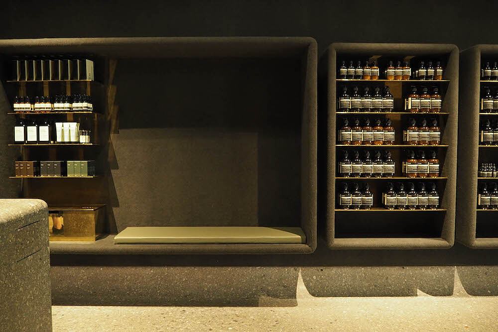 墻上裝有用毛氈包裹的擱架,擱架向外延伸,化為形如遊廊的三人座位。頂燈與天花板融為一體,位於水槽和櫃檯上方,營造出虛實相生的奇妙效果。店內備有Aesop完整的全套護膚、護髮和身體保養產品,這些產品選用了最優質的植物成分和實驗室研製成分。