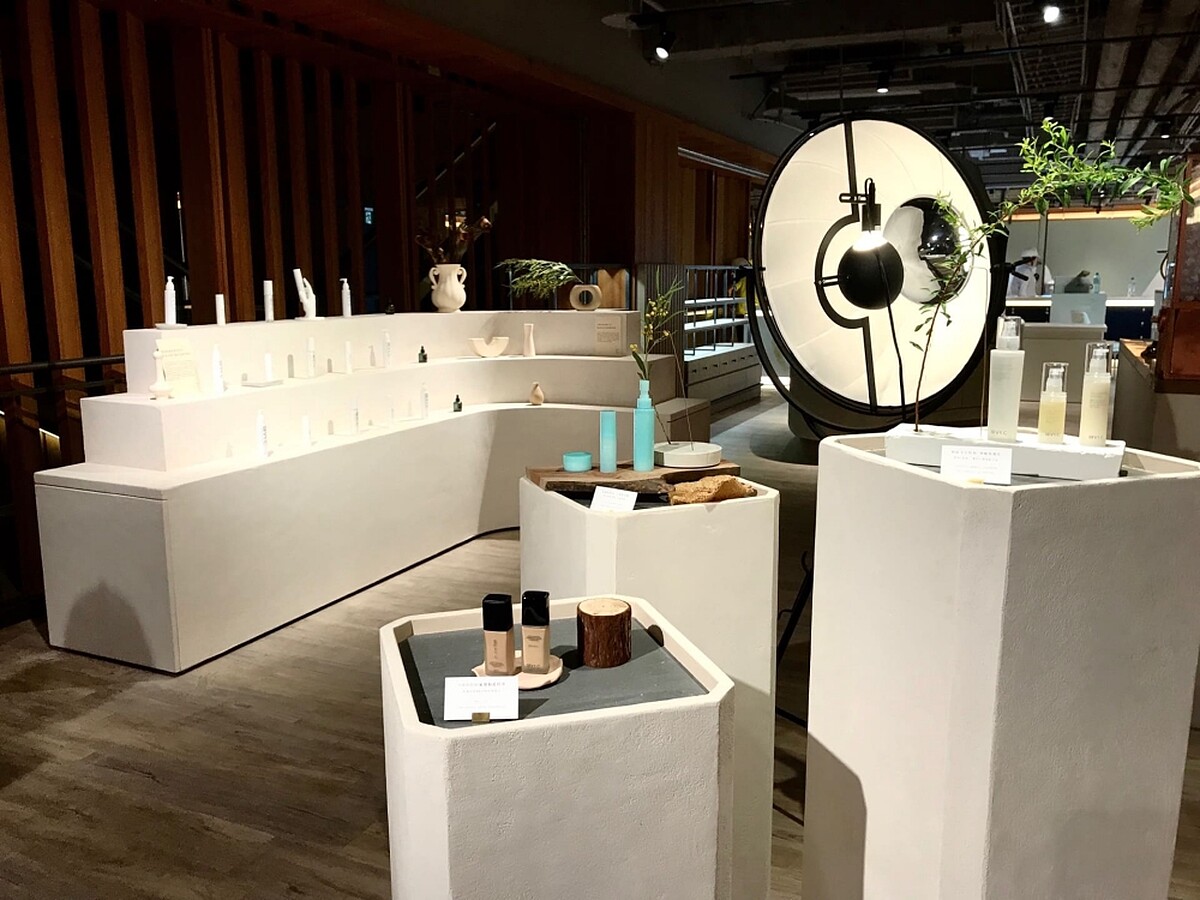 以「閱讀肌膚」為櫃位設計主題,直接把裝置藝術搬進櫃內,打造出一整面肌膚仿生牆,並以屬於環保再生建材的亮彩琉璃打造出「沉淨洗手槽」,透過專櫃設計傳達綠藤生機致力於環境永續、貼心體驗等理念。