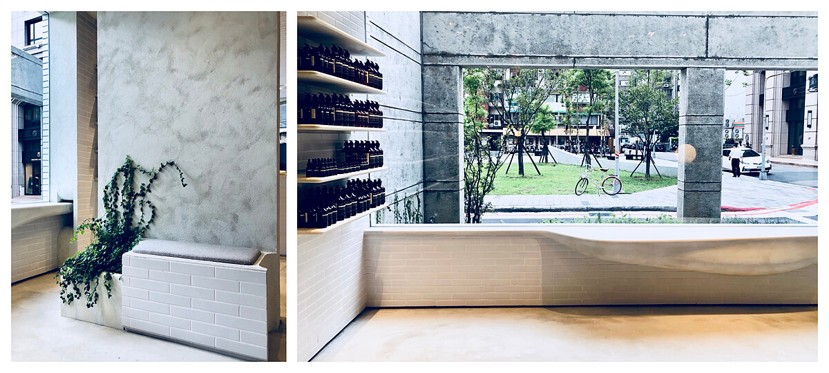 這次與Aesop合作的設計公司Mlkk Studio,為了更明確的掌握台北大安區在地特色,曾多次來此探訪,他們日與夜觀察、漫遊、紀錄、思考,於是一種非常直覺式的大安店雛型在腦海中慢慢成形,相較於其它視覺張力強的裝潢設計,他們選擇了貼近大安區靜謐氛圍的元素:「結合大自然與人造環境交織出的城市美態」。