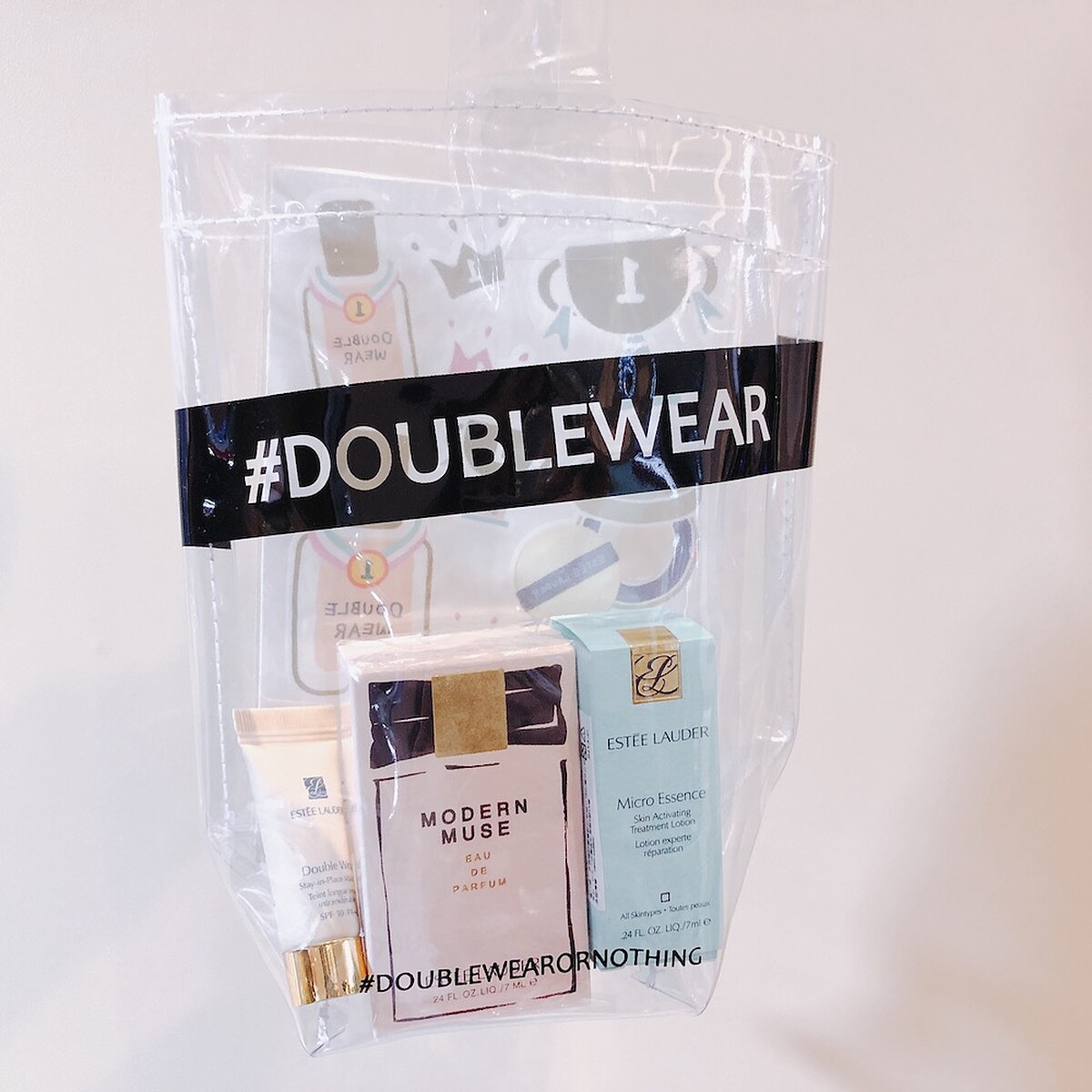 內含:DW 透明飲料環保手提袋+微分子肌底原生露7ml+粉持久完美持妝粉底5ml+繆思香水7ml+ Double Wear刺青貼紙,每日限量50個。
