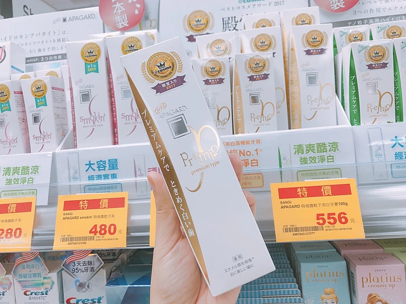 獨家引進日本熱賣的美白牙膏品牌「APAGARD」,其潔牙、去漬、美白效果超有感,更蟬聯多年日本COSME年度好物排行榜,同時也是許多日本明星愛用的品牌。包含修復、美白、防蛀牙的白色Mplus,常吸菸、喝咖啡、喝茶適用的紅色紅色Smokin,以及美白加強版的金色Premio。