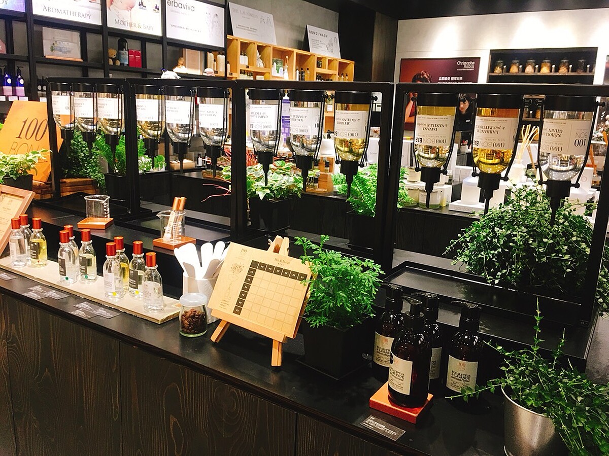 在101的100 BON形象店空間裡,由黑色鐵架佐木櫃,並在其中點綴著讓人格外清爽的綠色扶疏,為了實踐綠色香水理念,100 BON打造全台綠色香水旋風,將法國總店的「香水吧」概念複製來台,除了提供專業疊香諮詢,讓喜愛100 BON的香氛迷,透過氣味的自由堆疊,跳脫框架,打造專屬的香氛符號學!