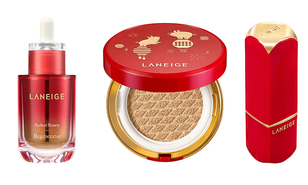 1.小金豬新年禮盒(上):禮盒內有必備完美氣墊底妝&霧感唇膏、加贈保濕定妝、深層毛孔清潔和夜間深層保養旅行組,一盒就能打造拜年走春必備好運妝容!