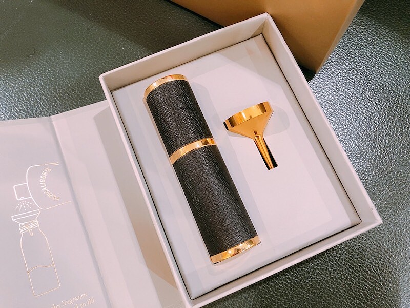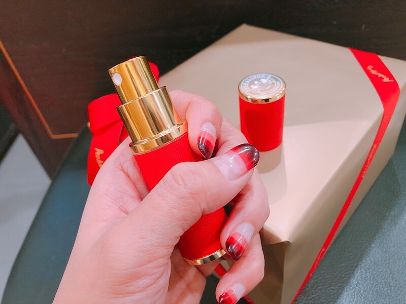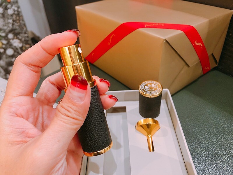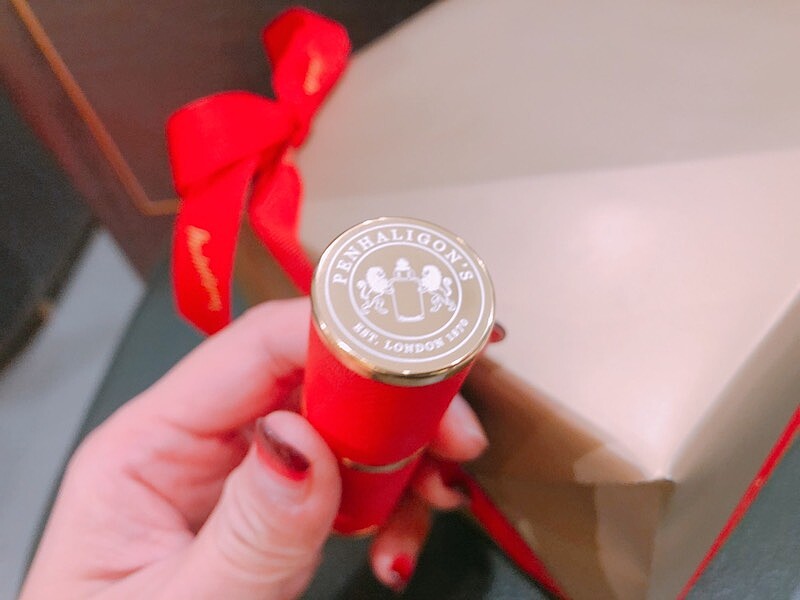 紅金搭配的分裝瓶約手掌大、相當精巧,底部還印有Penhaligon's的Logo,十足的貴族氣。