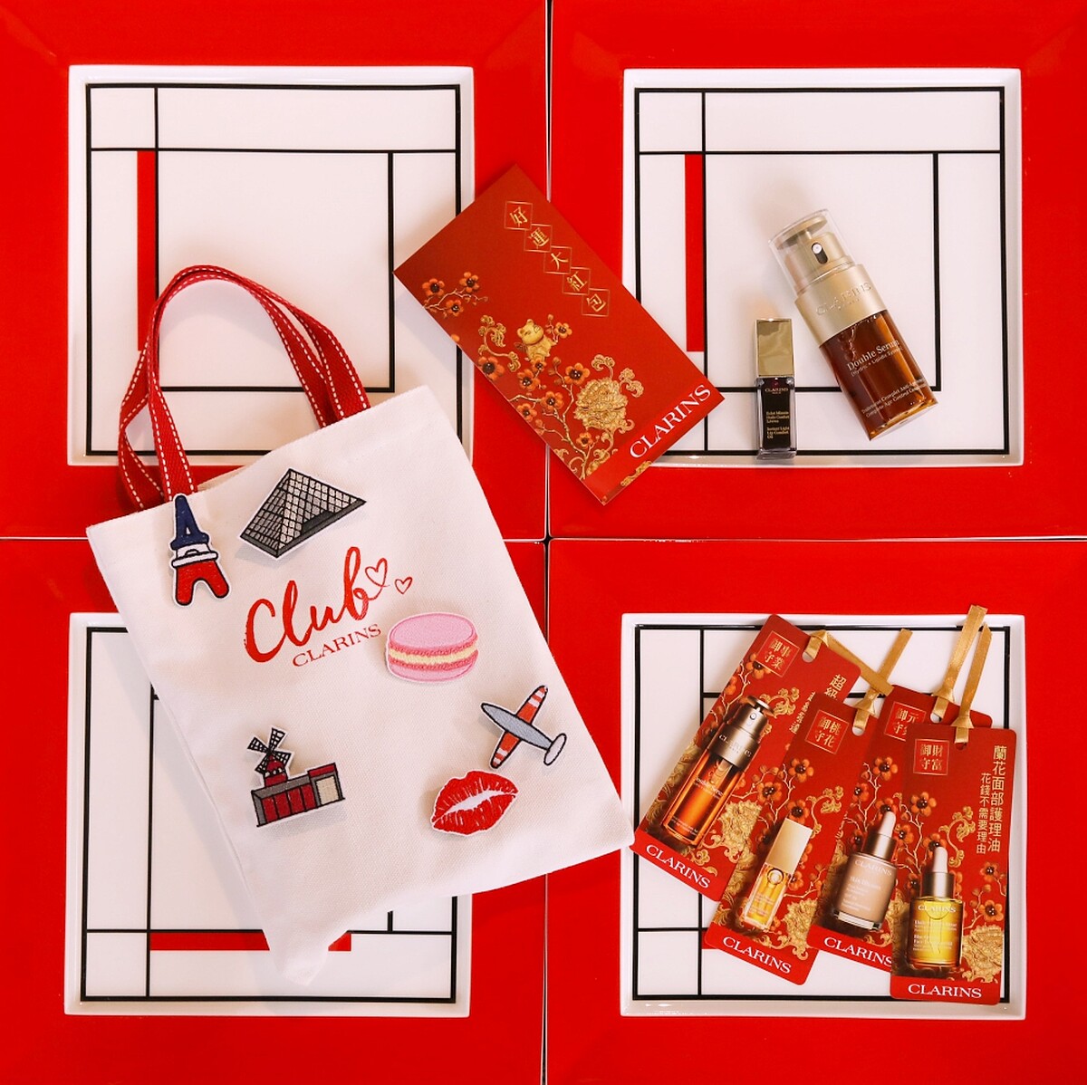 2019/2/5~2/11臨櫃購買任一款指定經典產品(包括黃金雙激萃、面部護理油或彈潤植萃美唇油,含特惠組),結帳後即可獲得中獎率100%的「克蘭詩好運大紅包」刮刮樂一張,最大獎「整單奉還」,當場免費點貨帶回家!