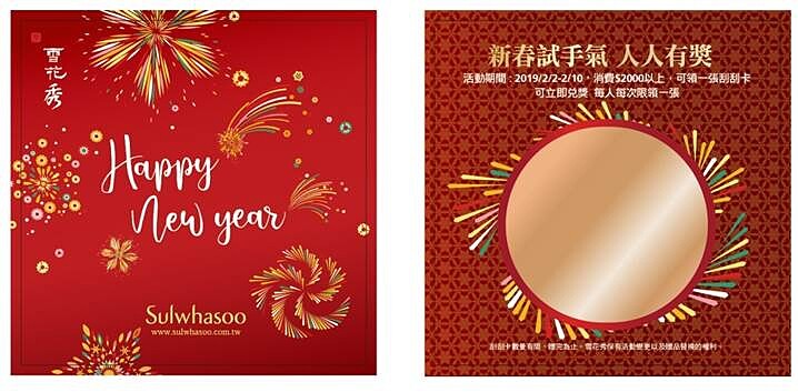 2/2-2/10期間推出「新春刮刮卡」活動,在櫃上單筆消費滿NT2,000,即可獲得一張。刮刮卡上共有7款豬年的吉祥話,每一句都能獲得相對應的贈品