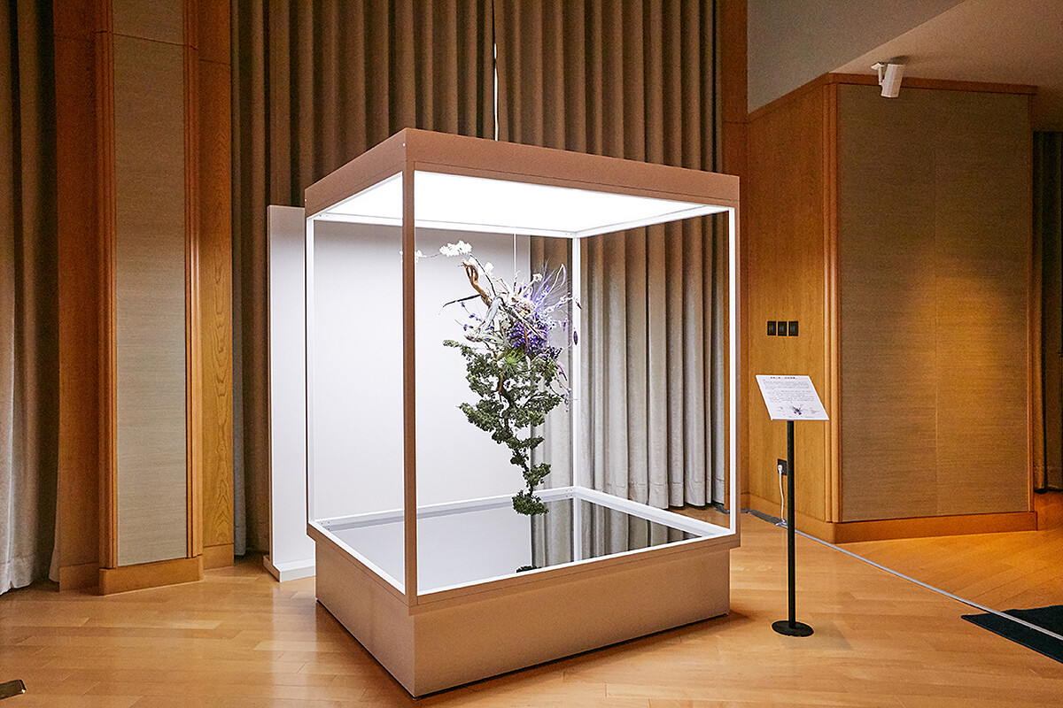 他的第2件創作「盛開創生」則以草月流派呈現不受任何規範與約束的美,透過少見的蕈類與珊瑚姿態,象徵源源不絕的生命力。