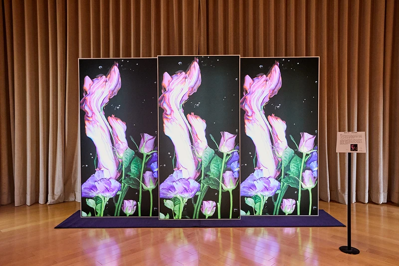 另一個作品則是曾獲台北美術獎首獎的黃博志,擅長以數位科技聲音影像顛覆作品呈現的可能性,因此可以他的在創作中欣賞影像的拖影、殘影、立體感,這次的創作結合「小源流派」,構圖的變化講究個體與群體的比例,正如保養步驟中層層疊疊的滋養,打造出來的耀眼光采。