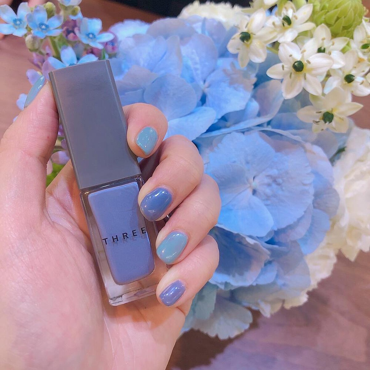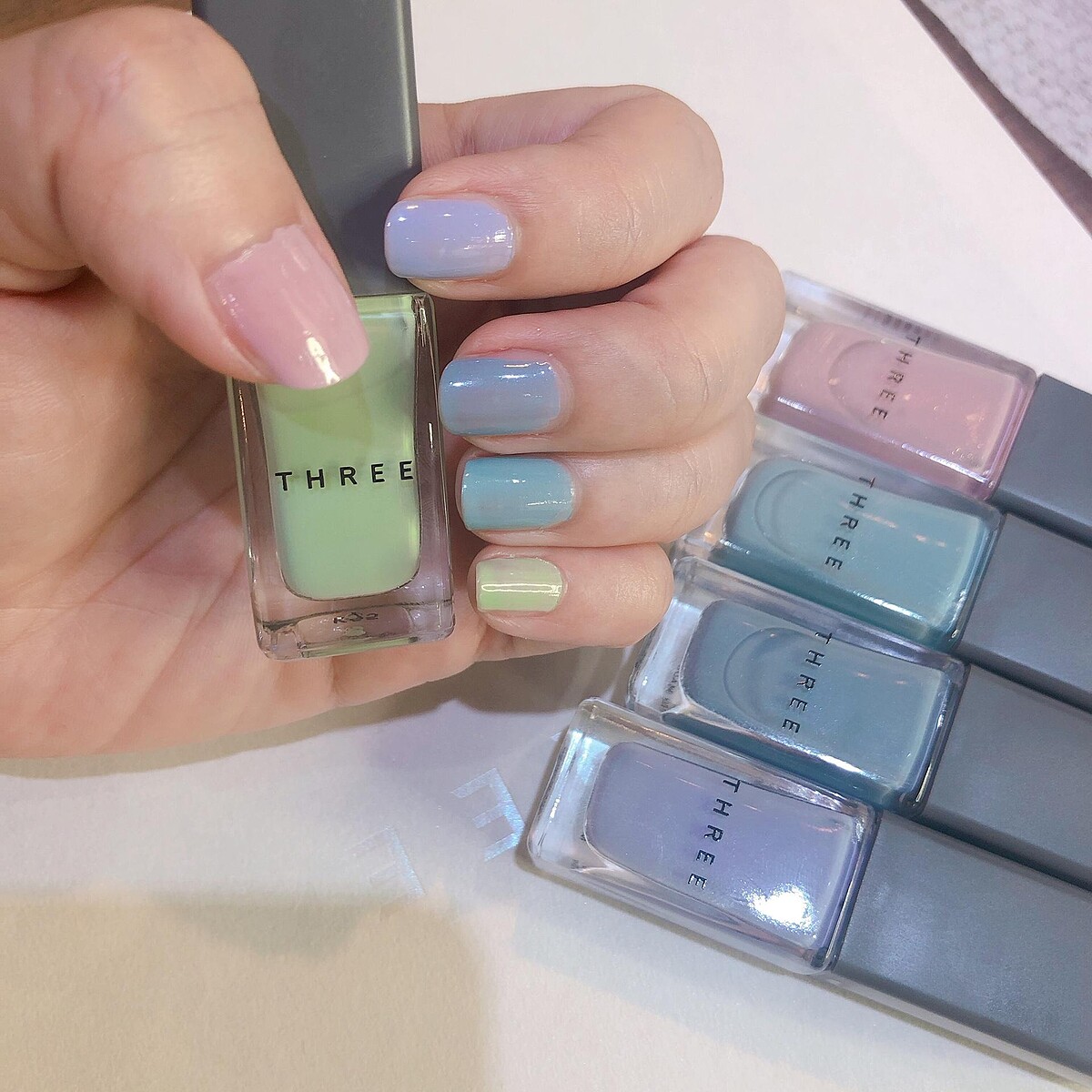 還有相當清新的奶茶綠、薄荷綠、粉藍色等,色彩中帶有Three特有的灰調,搭配膚色相當顯白,各種膚色都可以嘗試!