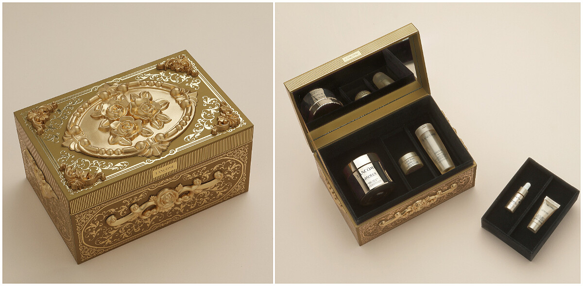 第一組要介紹的,是以具有全方位非凡抗老修護效能的《絕對完美黃金玫瑰修護乳霜》為主角,搭配同系列產品,讓婆婆媽媽奢華體驗蘭蔻頂級保養系列中的五大經典,精緻的法式手工禮盒還可直接變身輕奢珠寶盒,更是成為梳妝台上的美麗風景。