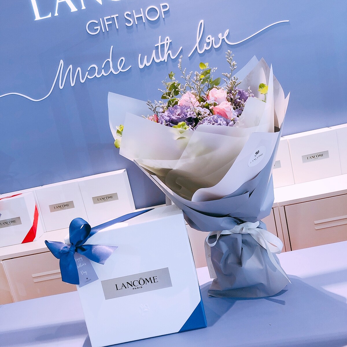 2019蘭蔻獻上最暖心的母親節,在全台11個專櫃打造2019《青春花屋》巡迴快閃店,並以蘭蔻口碑第一的乳霜「青春霜」的紫色系為主,布置出優雅夢幻的紫色法式花屋,有著大量進口玫瑰與紫色桔梗、紫星辰、卡斯比亞…等美麗鮮花點綴。《青春花屋》現場更邀請擅於詮釋法式風格的花藝師駐店,現場悉心設計玫瑰花束,彷彿身處巴黎瑪黑區花店的迷人氣氛。