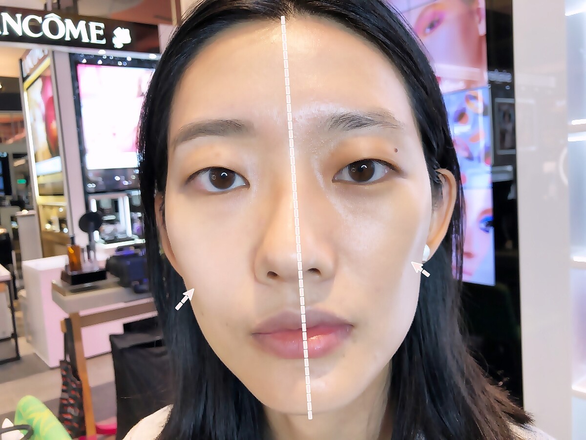 最後會一步步示範如何用粉底液畫出有立體感的妝容,右臉已上底妝的部分就顯得比較拉提感。