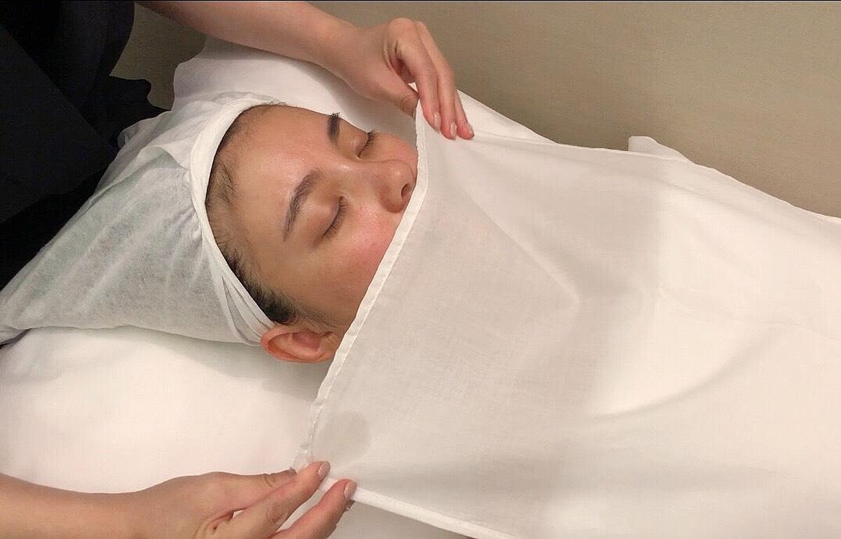 Step 7. 潤燥面膜敷臉(15 min)使用潤燥精華面膜敷臉,並在面膜敷上肌膚後,用指腹沾一滴顧客所選的相生精萃油,輕點在迎香穴處,深層舒緩放鬆肌膚。
