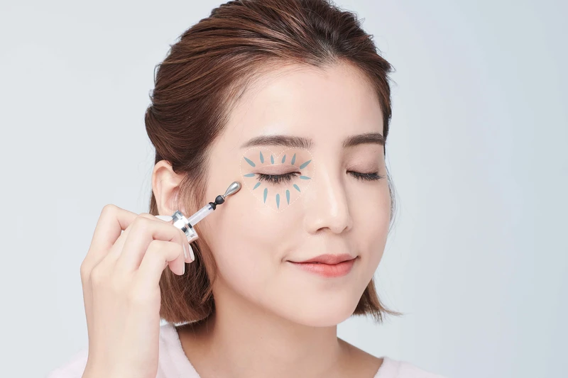 分別由上眼皮與下眼皮往前方眼頭處滑動,彷彿大愛心的形狀,最後停在睛明穴按壓一下,透過咖啡因萃取舒緩,鎮靜長時間容易敏感的眼周肌膚,同時飛減緩黑眼圈的形成。