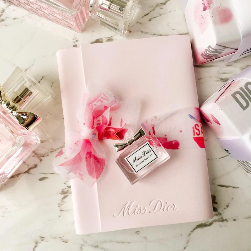 這繫著花瓣緞帶蝴蝶結的精裝筆記本,拉開緞帶後能觸摸到軟絨皮質的粉紅書衣,而側邊渲染著玫瑰花瓣插畫的內頁,邀妳記錄最私密也甜蜜的愛戀絮語;再來就是,凡購買任一Miss Dior產品即可享有花漾迪奧包裝服務,以粉嫩的玫瑰花瓣插畫包裝妳的愛戀心意。