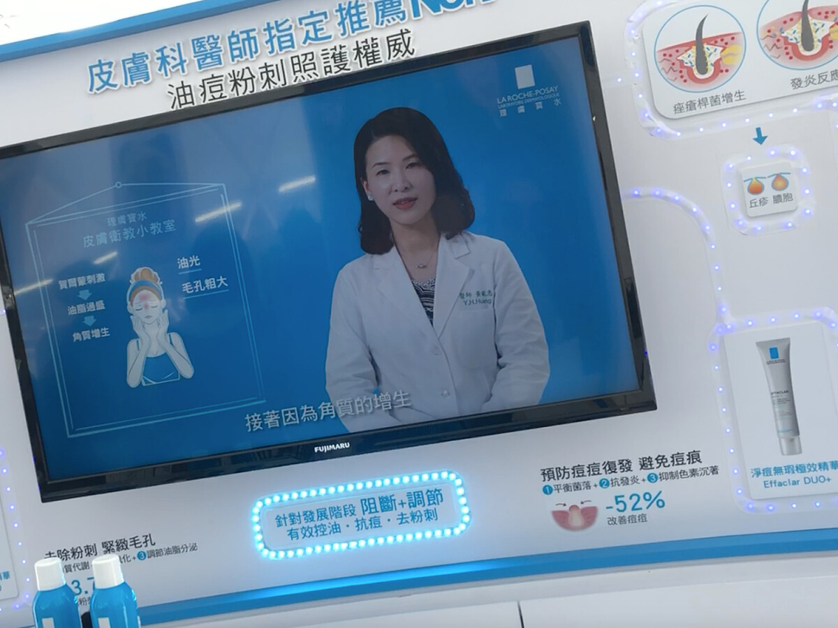 肌膚實驗室內設置了大型互動衛教牆,可在此了解油痘粉刺問題產生過程,及如何採取正確抗痘保養。