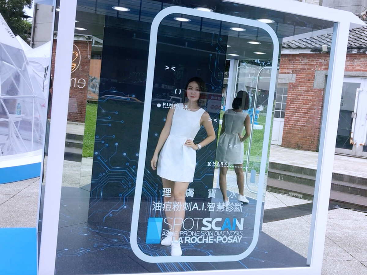 實驗室外還有一座大型手機版「SPOTSCAN 拍照打卡點」,進入後透過鏡像可以看見三面向的自己,彷彿置身於科幻空間裡,只要拍照打卡上傳 #理膚寶水肌膚實驗室、#油痘粉刺AI智慧診斷,就可以免費印製IG相片。