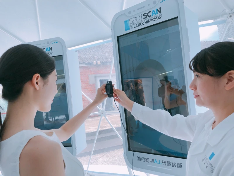 四座大型螢幕搭載「理膚寶水油痘粉刺A.I.智慧診斷SPOTSCAN」,現場由專業藥師及美容師駐點一對一操作,只要拍三張照,臉部油痘粉刺問題就會全面現形,可以針對個人肌膚瑕疪獲得專屬保養建議。