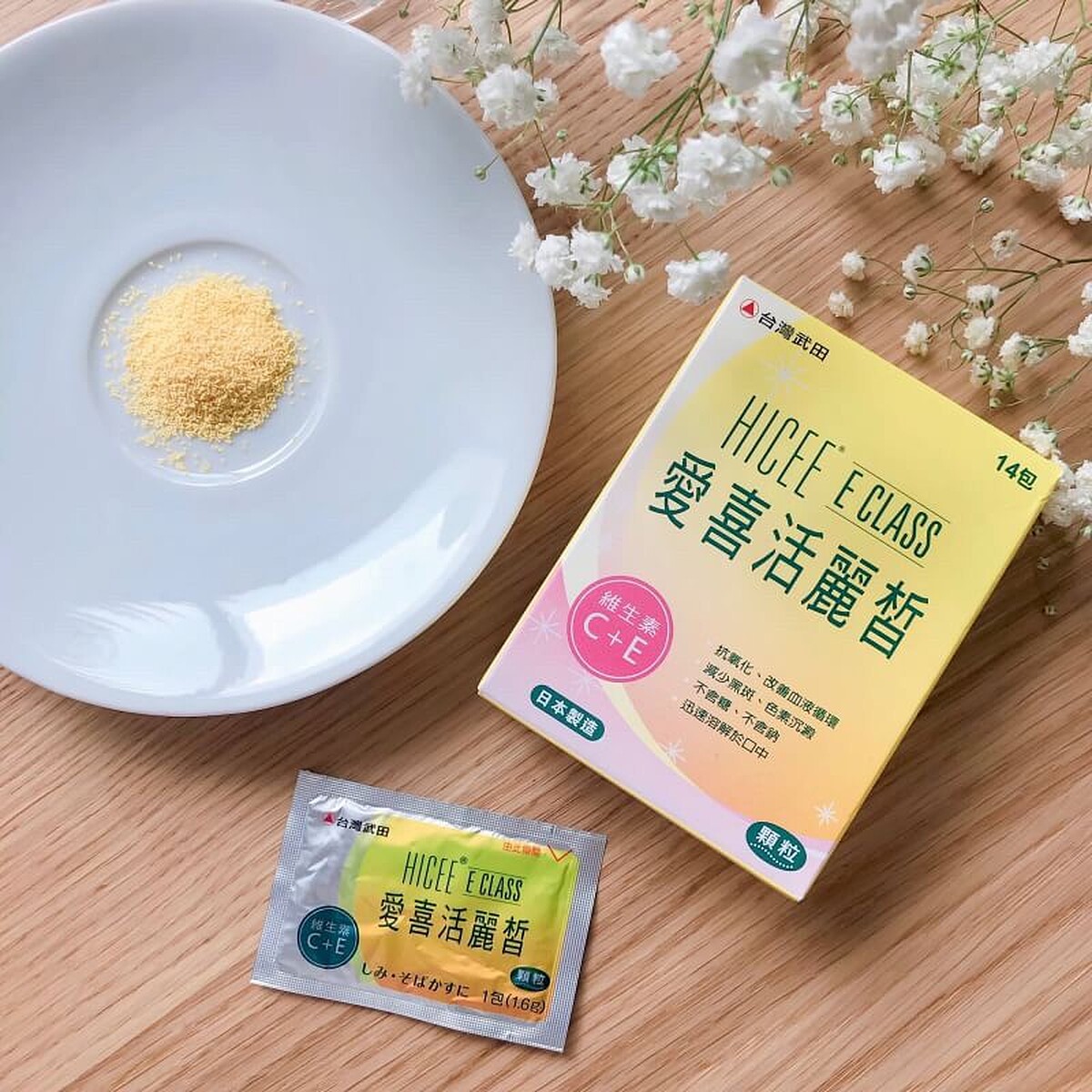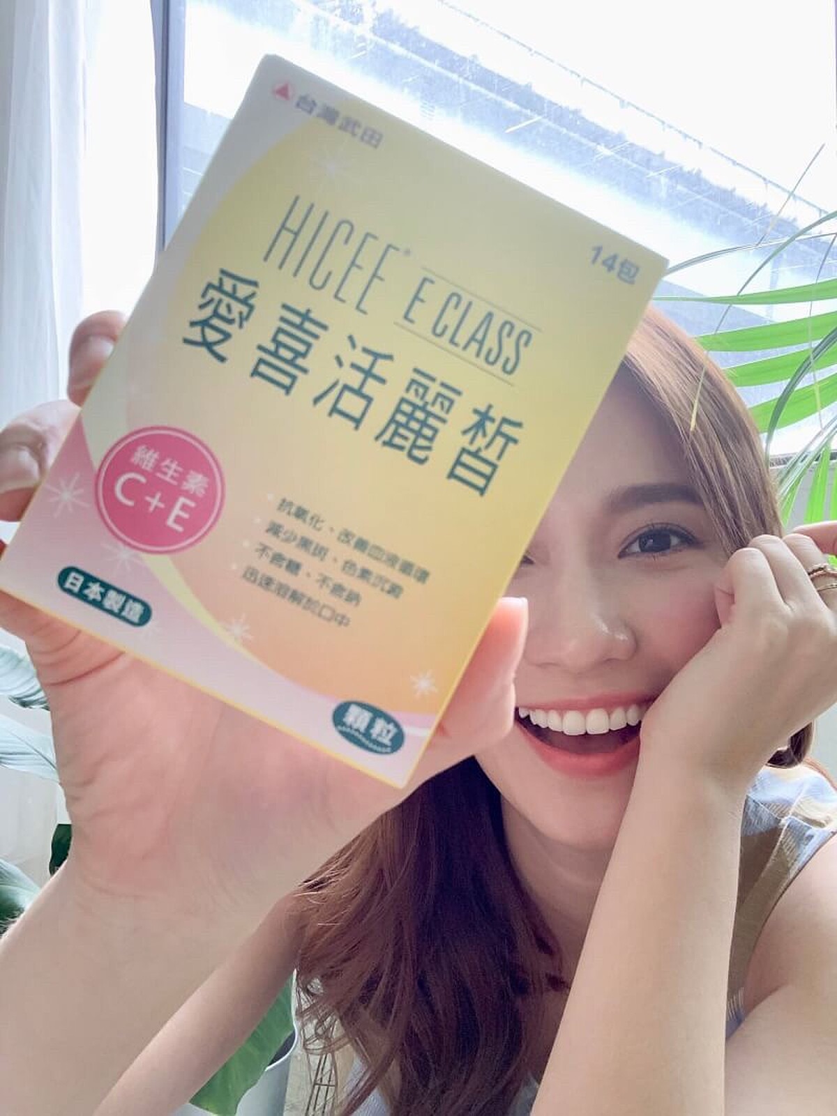 來自日本家喻戶曉、銷售第一的大藥廠----武田,HICEE®E-class愛喜活麗皙的醫美級配方內含維他命C 500mg、維他命E 100mg、維他命B2 4mg,不但有抗氧化的效果、淡化黑斑,更可幫助舒緩現代人常見的身體緊繃疲勞狀態、提升活力。不含糖、不含鈉的HICEE®E-class愛喜活麗皙,嚐起來的口感令美食主義者Jaline很讚賞:「有些維他命C會有奇怪藥味,反而讓人不想吃…但愛喜活麗皙是酸酸甜甜的味道,直接口服也沒問題!」