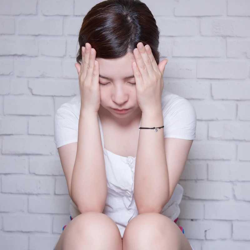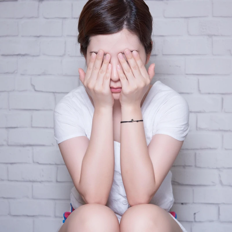 Step1:採坐姿並將掌心輕蓋眼周及額頭,以手掌托住頭部重量