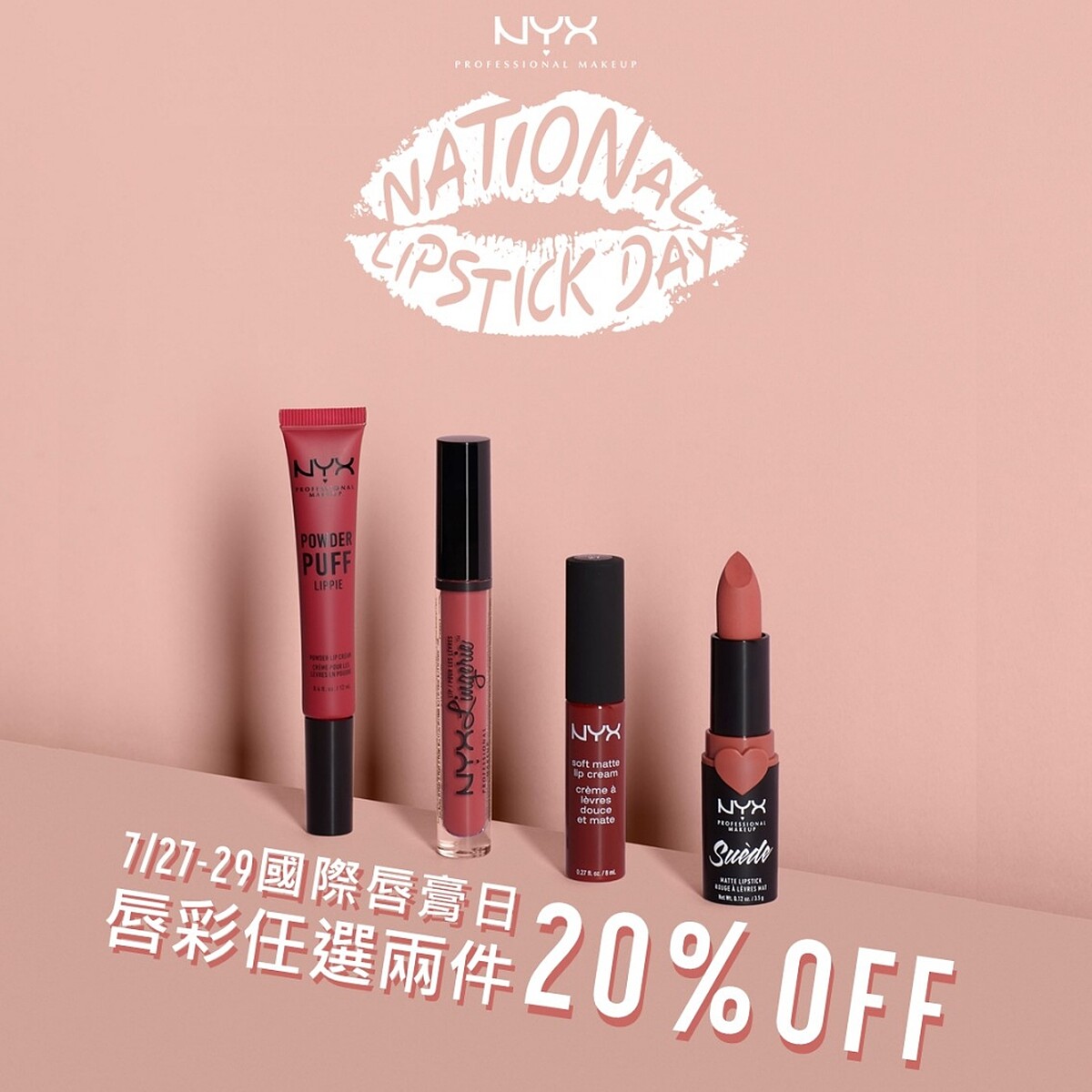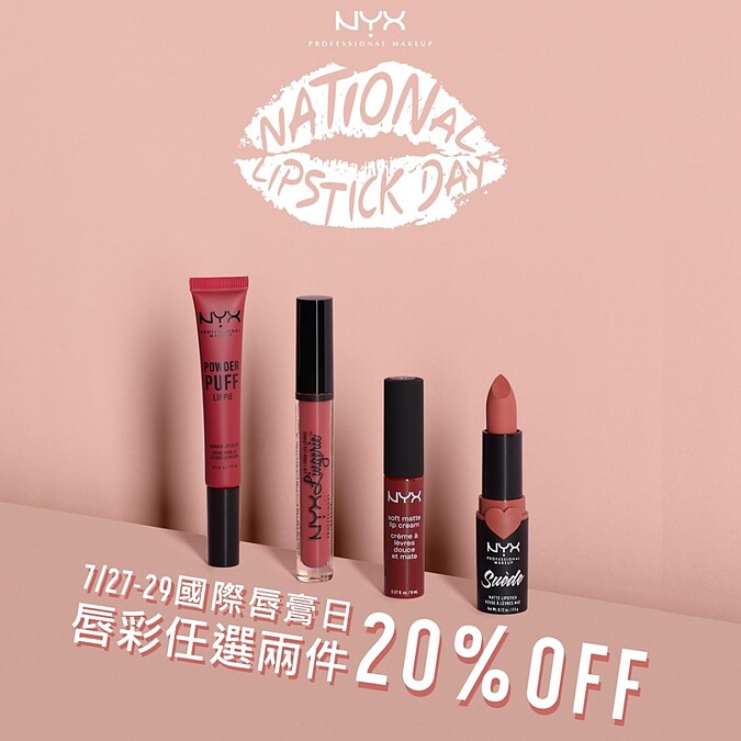 來自 LA的重妝專家NYX Professional Makeup,歡慶7/29國際唇膏日的到來,於7/27~7/29限時推出全系列唇彩任選兩件8折優惠活動,平均每支唇膏都NT300有找!包含最受歡迎的貼身愛撫裸色唇釉、澎澎泡芙氣墊唇釉、棉花糖柔霧唇釉與皮革絨光霧感唇膏等唇彩產品,通通能輕鬆帶回家。