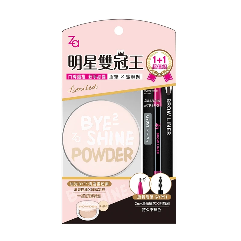 一次包括旋轉眉筆、蜜粉餅這2款za的好評商品。旋轉眉筆擁有2mm筆芯+實用眉刷,易於描繪細緻眉型,還附有眉刷可梳順眉流。油光BYE2清透蜜粉餅則添加油光吸附粉末,幫助控油定妝。這款組合限屈臣氏獨家販售。
