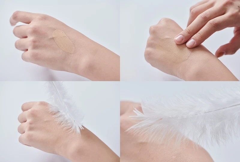 2.反孔特霧輕盈裸透感保證:大家都討厭黏膩厚重的底妝,讓M編實測給你看反孔特霧有多清爽,用手塗抹粉底後的肌膚,連羽毛都不沾黏!