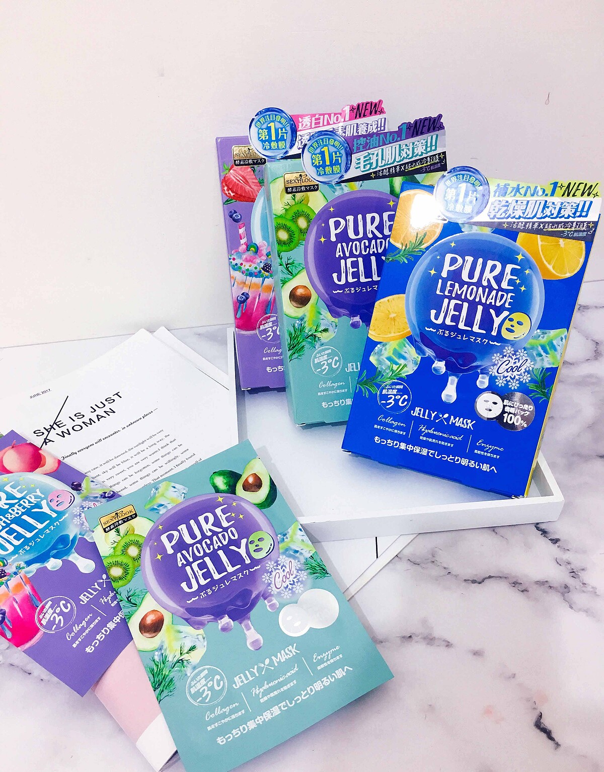 除了藍色款,M編大推紫色款「酵素淨白透亮冷敷膜」,淡淡粉嫩的QQ凍膜,加入高效美肌淨白配方,敷面膜的同時幫肌膚溫和代謝老廢角質,肌膚不只變亮更變健康。
