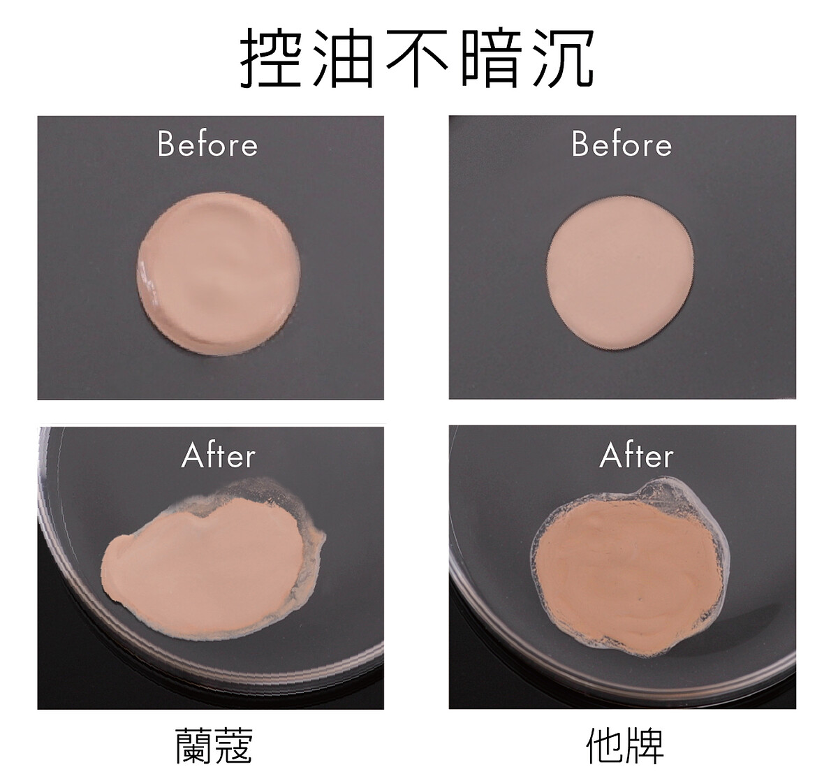 最後,為了證明零粉感持久粉底的C位的關鍵,蘭蔻特別進行了以下不造假實驗,分別針對大家最在意的粉底時間越長就越暗沉,以及持久型粉底容易出現乾紋進行【完全沒有經過後製處理】的實驗影片。將零粉感超持久粉底與他牌粉底分別滴入接近人體出油的油脂,會發現零粉感超持久粉底的顏色完全沒有改變,氣色好上一整天不假!