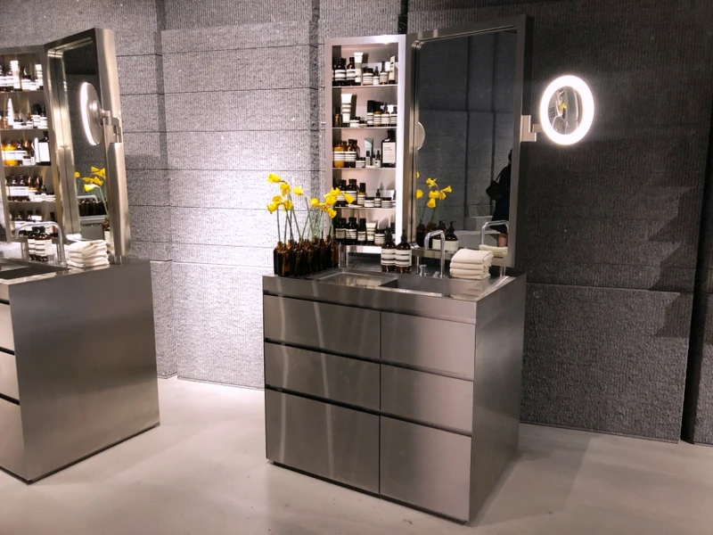 再往後走,就可以看到Aesop店面第一次出現的個人體驗區,一共有三座,具備櫃子、鏡子、化妝燈,外型就好像個人的梳妝台一樣。