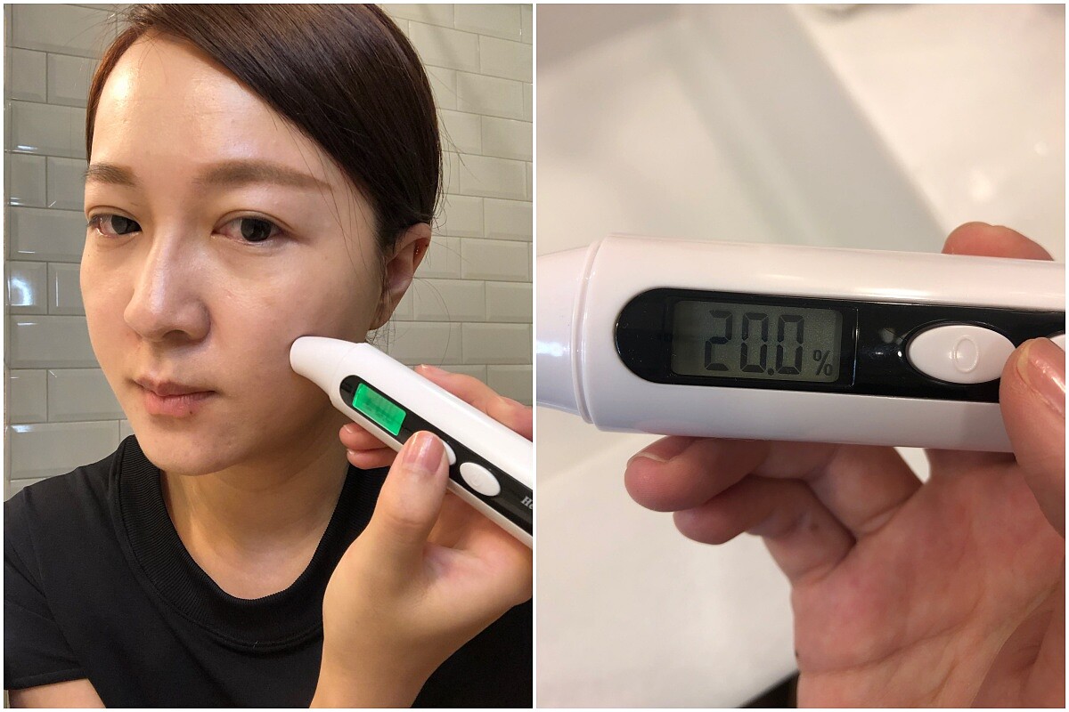 在未上任何保養品前,M編的肌膚較乾,秋季換季兩頰較乾易脫皮,使用保濕儀器測試的保水度數值為20%,屬於乾性膚質,一般來說,臉頰的含水量應該會大約在30-50%之間。