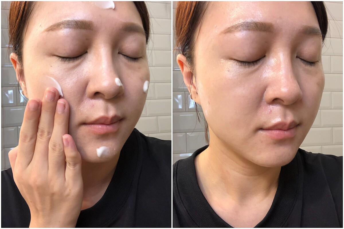 以 Rodial「龍血保濕水凝膠」塗抹全臉,除了保濕也有相當的修護能力,在秋天換季的時候,非常適合M編使用,右圖可以看到塗抹後肌膚呈現的亮度,因為質地較濃稠,可以直接作為保養的最後一道程序,所以使用後也可以依照季節與肌膚的狀況,再選擇是否需要再擦上乳液。