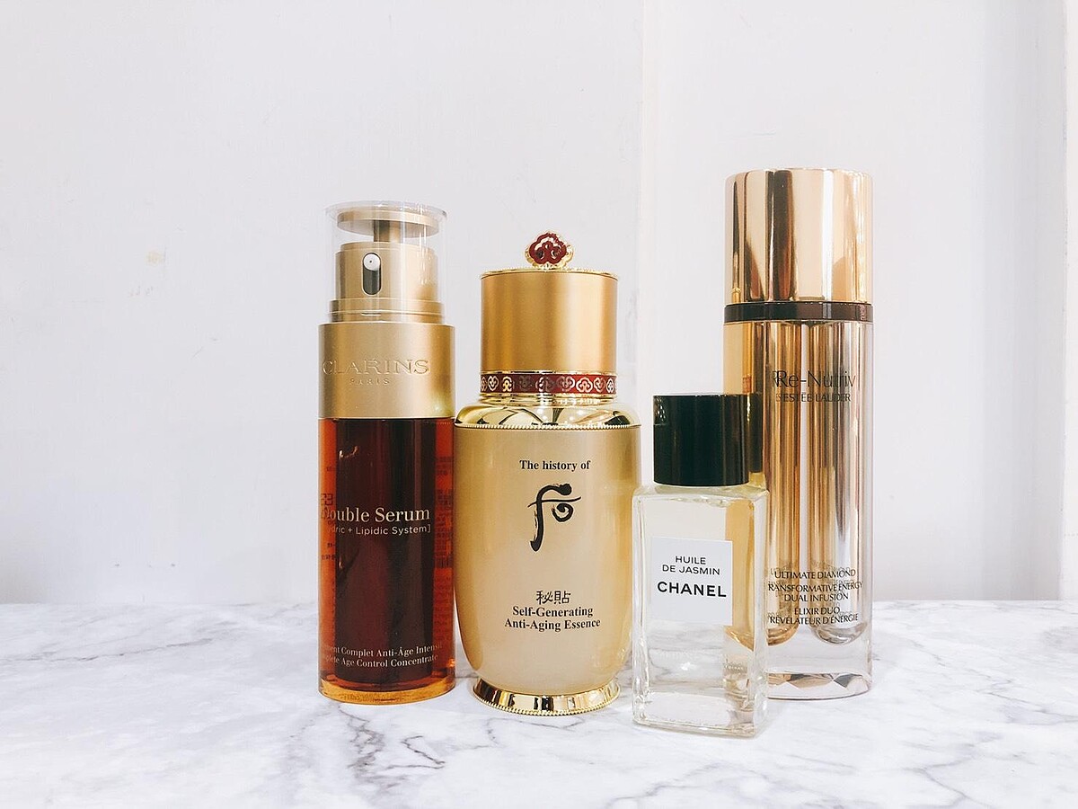 對於保養品的挑選比較嚴格,採訪時一定要挖到最深、了解透徹到讓人想翻白眼,購買產品前非得試用,或求好友讓我嘗試確定「有感」才開荷包,一旦愛用,價格總是排列在最後的選項,最近有感的產品是Estee Lauder 白金級黑鑽松露雙活萃、Clarins 超級精華黃金雙激萃和Whoo后的重生秘帖,Chanel 經典茉莉精萃油則是我的祕密武器,質地輕盈又好吸收,肌膚變得柔軟光澤,對自己的膚質信心大增。