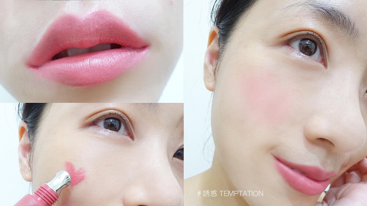 #誘惑(TEMPTATION ):M編私心最愛的珊瑚粉色,超顯白的氣質女神色,約會必擦脫單色,擦起來讓唇頰自然呈現嫵媚嬌嫩的溫柔優雅光暈。
