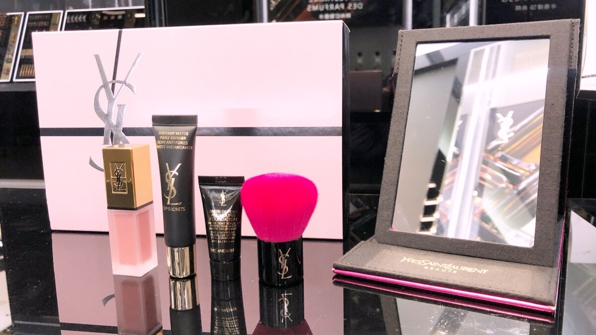 2.預購會NT20,000滿額禮:名模機密特霧持妝凝乳15ml+恆久完美無瑕粉底(#B20)5ml+時尚印記絲絨唇露(#25)正貨+桃色唇情刷具+桃色唇情立鏡+YSL訂製化妝包(隨機)。