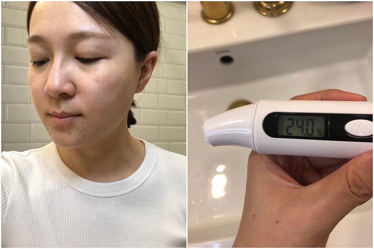 M編的肌膚正好是秋冬換季的的受害者,表層水分容易流失,需要加強保濕;下巴因為生理期前也有些痘痘,用保濕儀器測量可以看到飽水度只有24%,屬於偏乾的膚質,再加上剛好在換季時節,肌膚更加敏弱不適,正是使用「雪珍珠超能修護面膜」的時候!