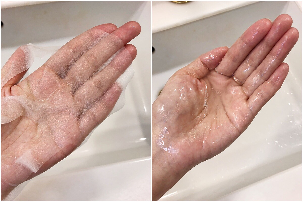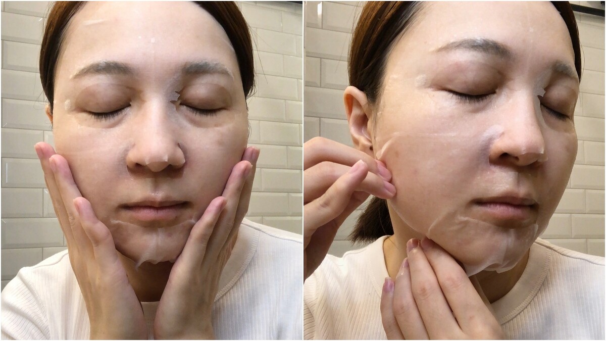 打開面膜可以聞到淡淡的植物清香,布膜非常輕透沒有厚重感,不仔細看根本沒發現布膜的存在,就算敷著看劇打報告也不會感到不舒適;適合亞洲人的剪裁服貼於鼻頭、鼻翼及唇周,精華蜜的質地有潤感但一點都不黏膩。