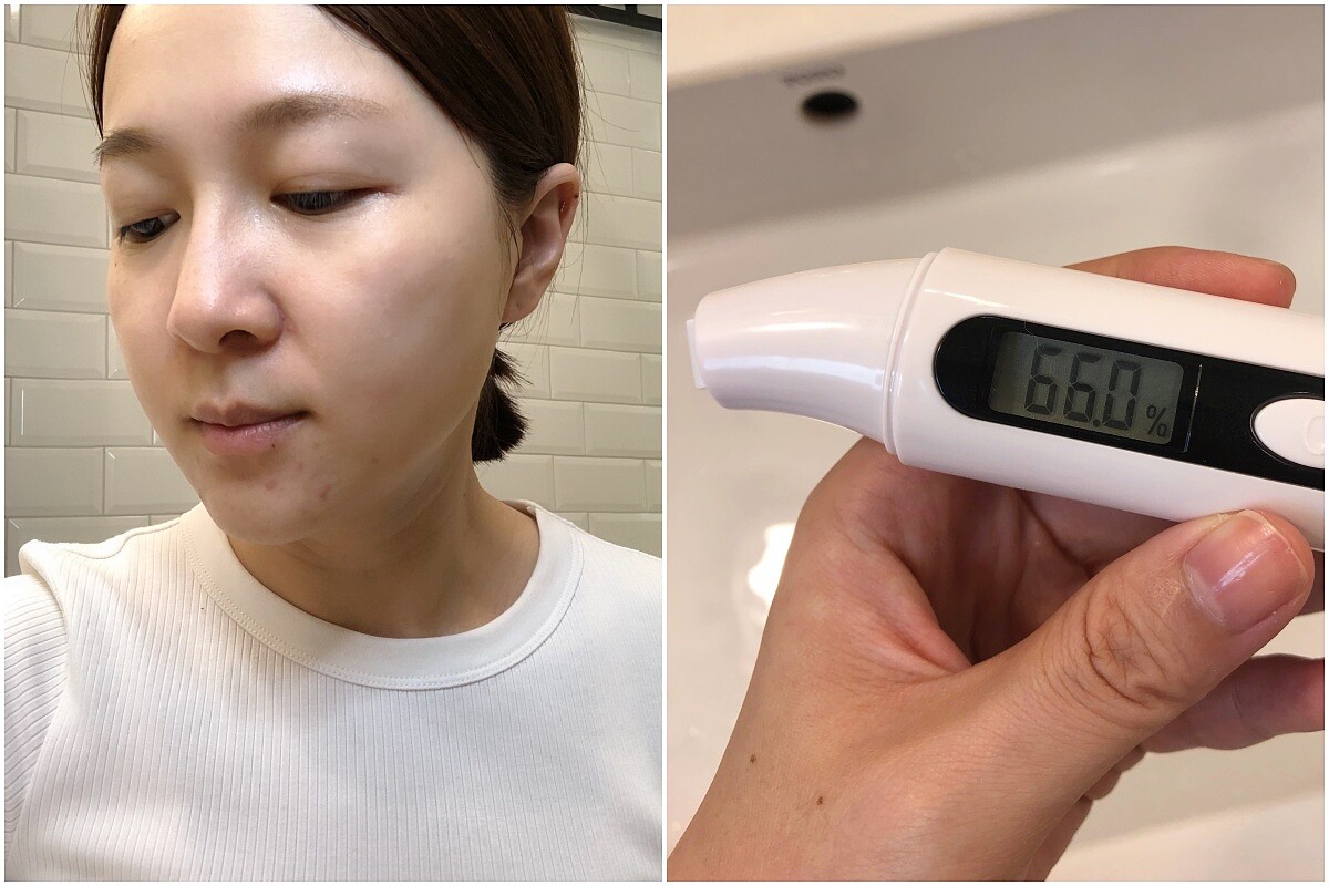 約10-15分鐘後,取下面膜可以看到肌膚保水度明顯提高,用保濕儀器測量數據明顯從24%提升到66%,兩頰也更加水潤有彈性,紓解了肌膚乾燥的狀況。