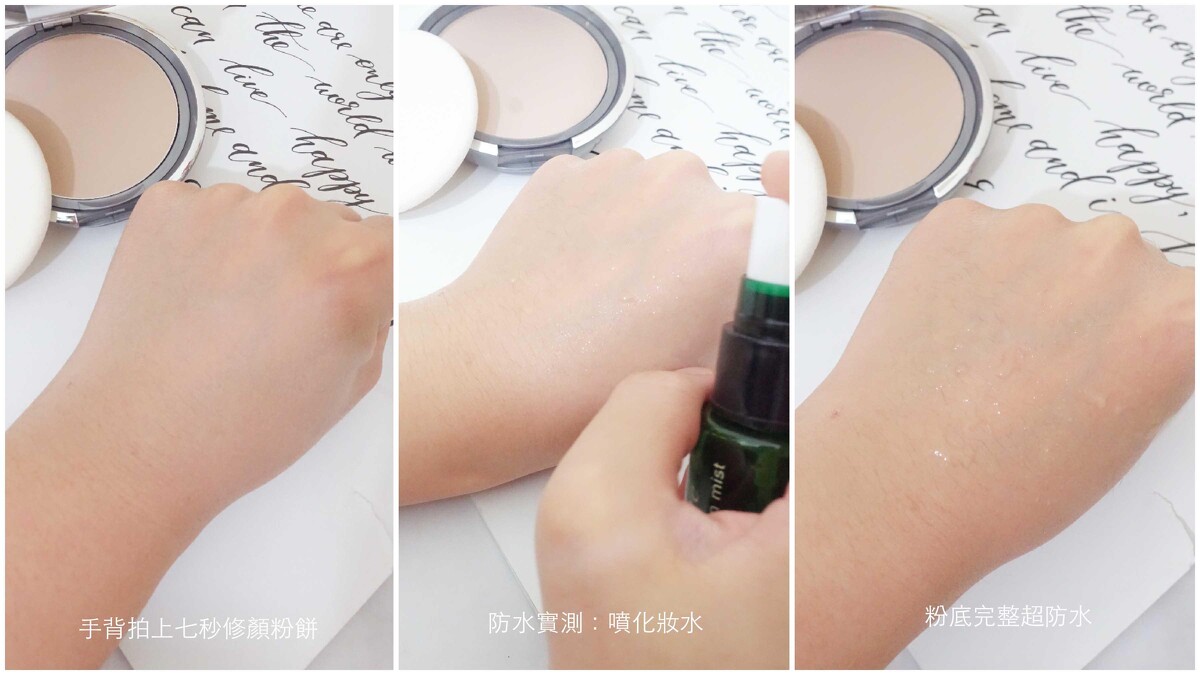 防水實測:直接近距離大量噴灑化妝水,水珠直接滑落,底妝緊緊貼膚完全不脫妝!