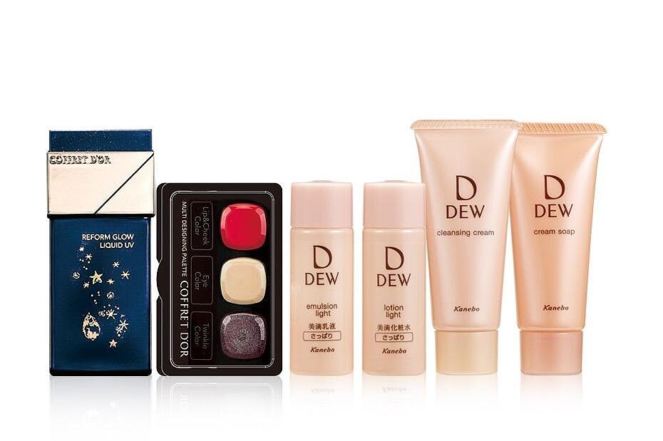 粉底+彩妝日本原裝限定組合,還加贈DEW保養四品組,等於買彩妝送保養,三天兩夜的小旅行帶這一組就夠了。