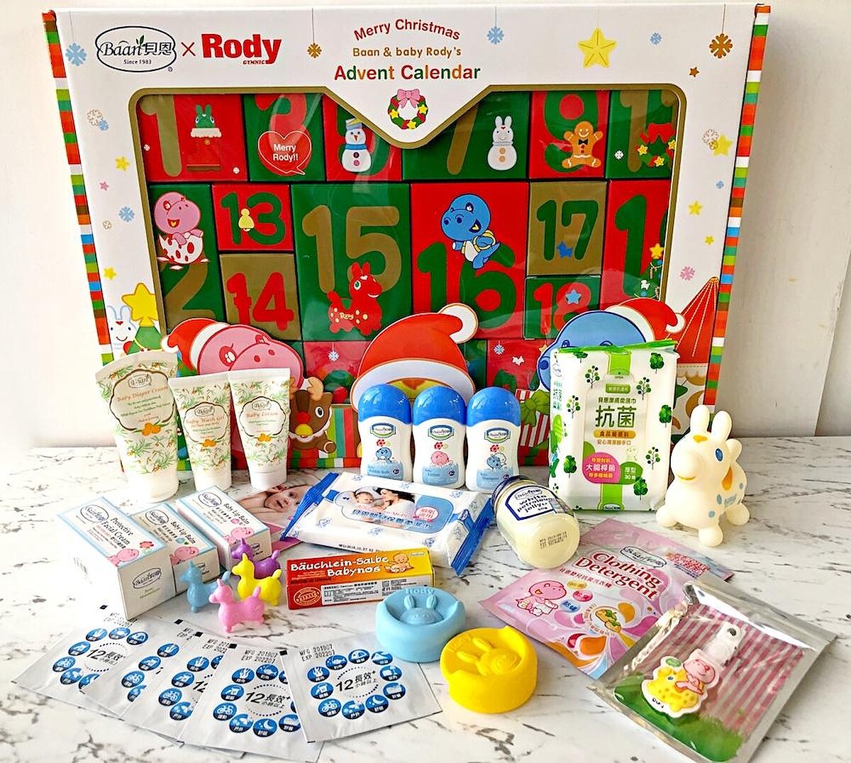 貝恩發現坊間很少有專屬嬰幼兒保養類的耶誕倒數禮盒,因此在2019年的耶誕節特別企劃中與知名義大利品牌Rody合作推出「貝恩x Rody聖誕倒數月曆」,讓爸爸媽媽們也能替寶貝們準備專屬的聖誕節禮物。