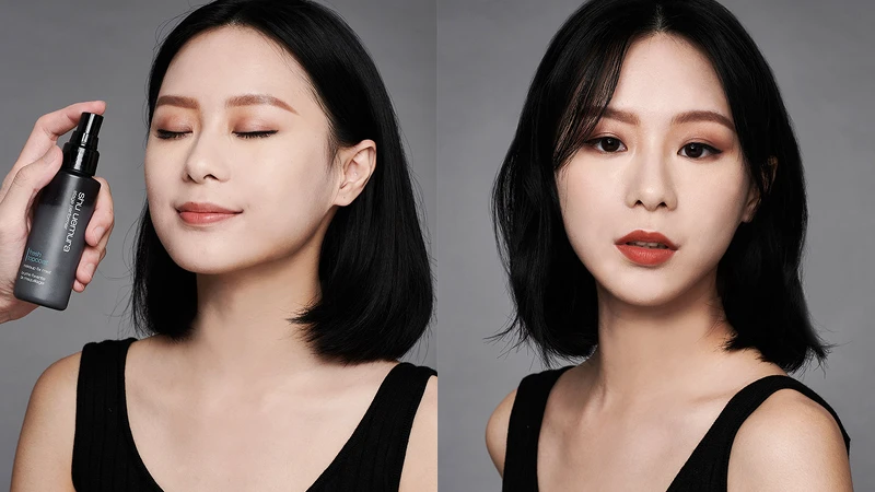 由於後臺快速的節奏加上不想要破壞粉底完妝的微霧光感,Ray推薦使用新型態的定妝噴霧。