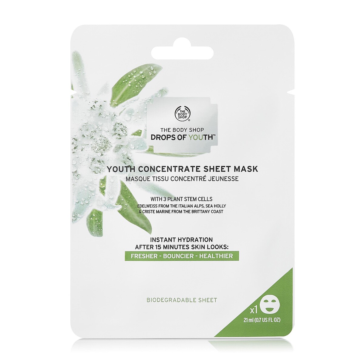 蘊含珍貴的法國海茴香、海刺芹、阿爾卑斯山雪絨花等複方美肌菁萃,能迅速補水活顏、長效撫紋緊緻;使全臉肌膚極緻澎潤、煥發青春彈力光采。採用環保生物可分解的植物性纖維面膜,觸感細緻可完美貼合臉部肌膚;使濃縮青春活萃密集滲透吸收、直達肌底。