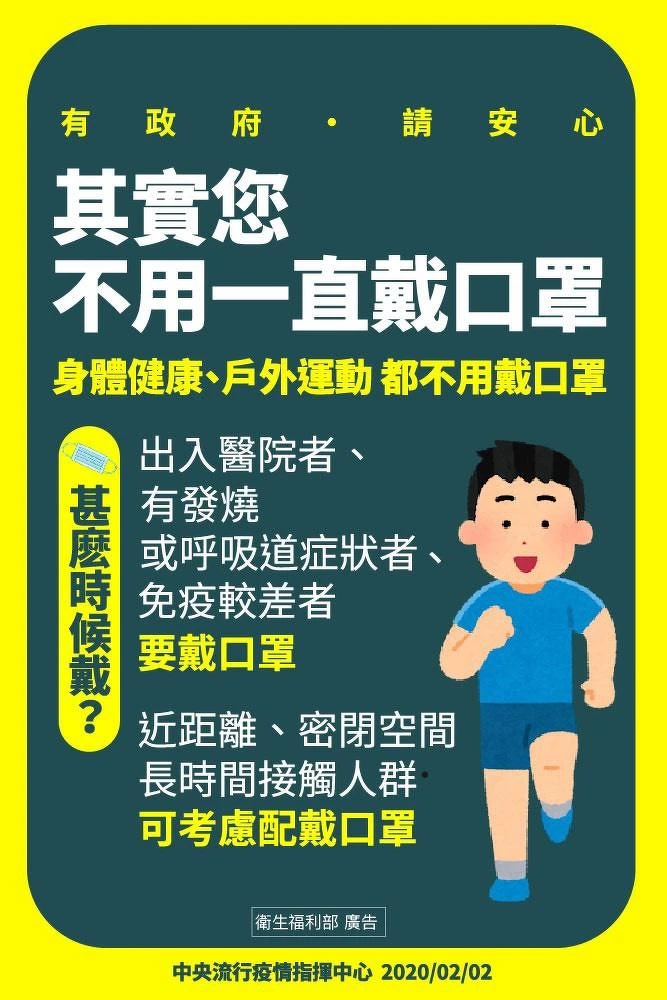 其實不用一直戴著口罩,2/2中央流行疫情指揮中心最新更新宣導。
