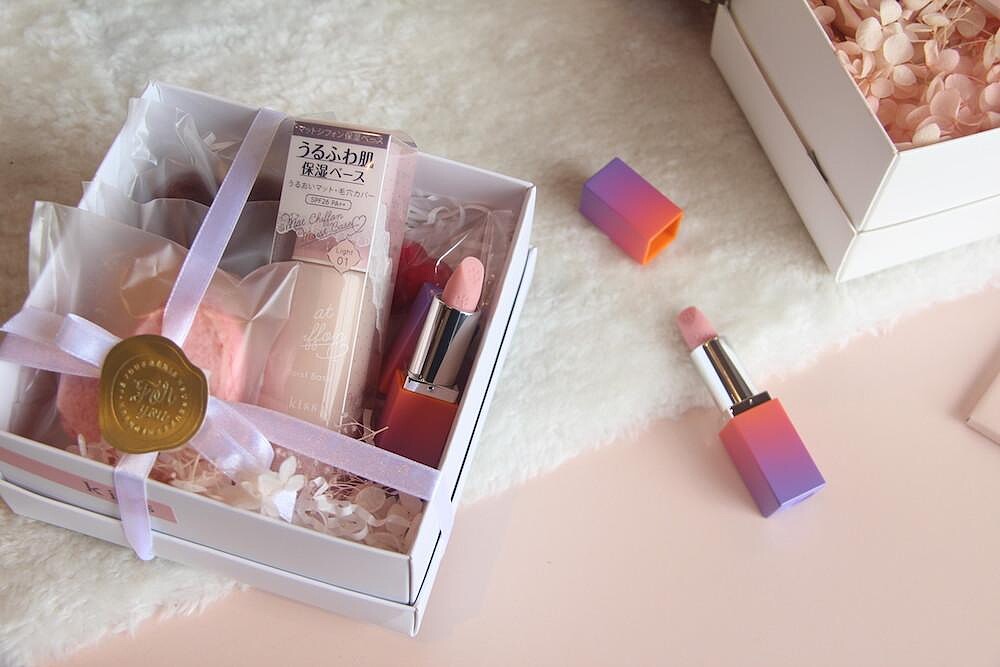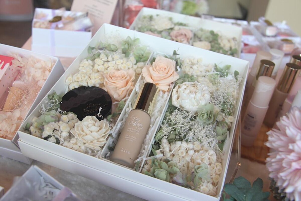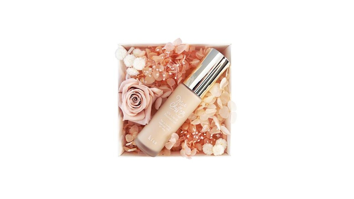 內含kiss完美持久微光粉底液、kiss雪紡珠光持妝蜜粉及滿溢戀愛氛圍的永生花盒。