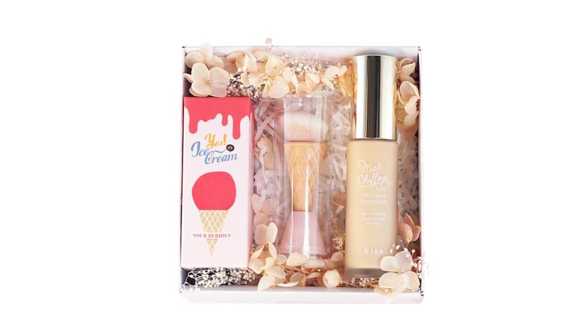 內含kiss完美持久微光粉底液及LSY林三益酸酸莓果冰淇淋粉底刷,。