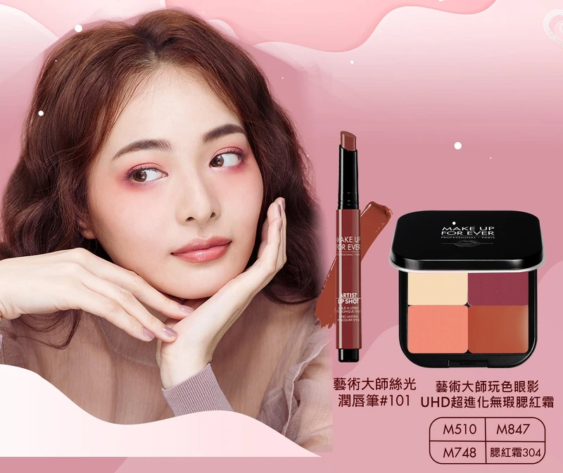 Make Up For Ever 設計了一組情人節限定的「春色無邊斬男妝」,更特邀KOL小賀Joanna擔任妝容Model,畫上春色無邊的妝容,秒變女神輕鬆斬男。並推出了「情人節限定4色拼盤」,內含藝術大師玩色眼影M501、M748、M847和UHD超進化無瑕腮紅霜304。