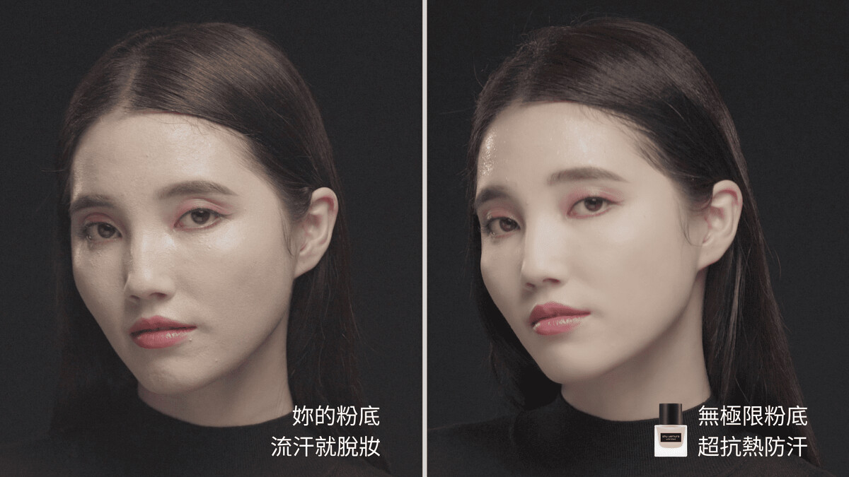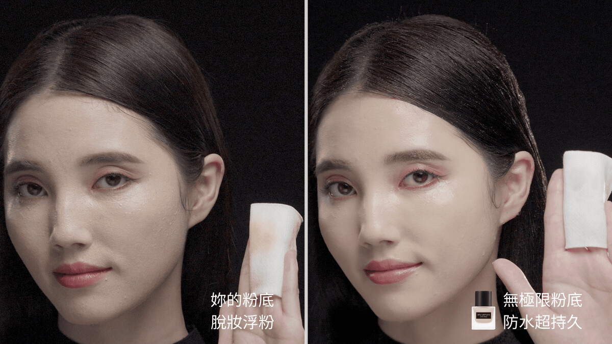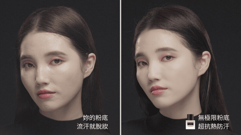 獨家的智慧持妝粉體,粉體外包覆著超薄定妝膜,完妝後粉底緊鎖於肌膚上,就算狂風暴雨讓妳全身溼透妳的臉真的超防水!尤其在粉底中加入了吸油因子,彷彿一整天有海綿般不斷為妳吸油,就算天氣再熱汗流再多,底妝還是超級完美。看影片就知道,他牌粉底面對小水槍、小吹風機,一下就脫妝浮粉。而無極限粉底面對超強水柱、超強熱風,居然完全不動如山!果真是超越持久的超強粉底!