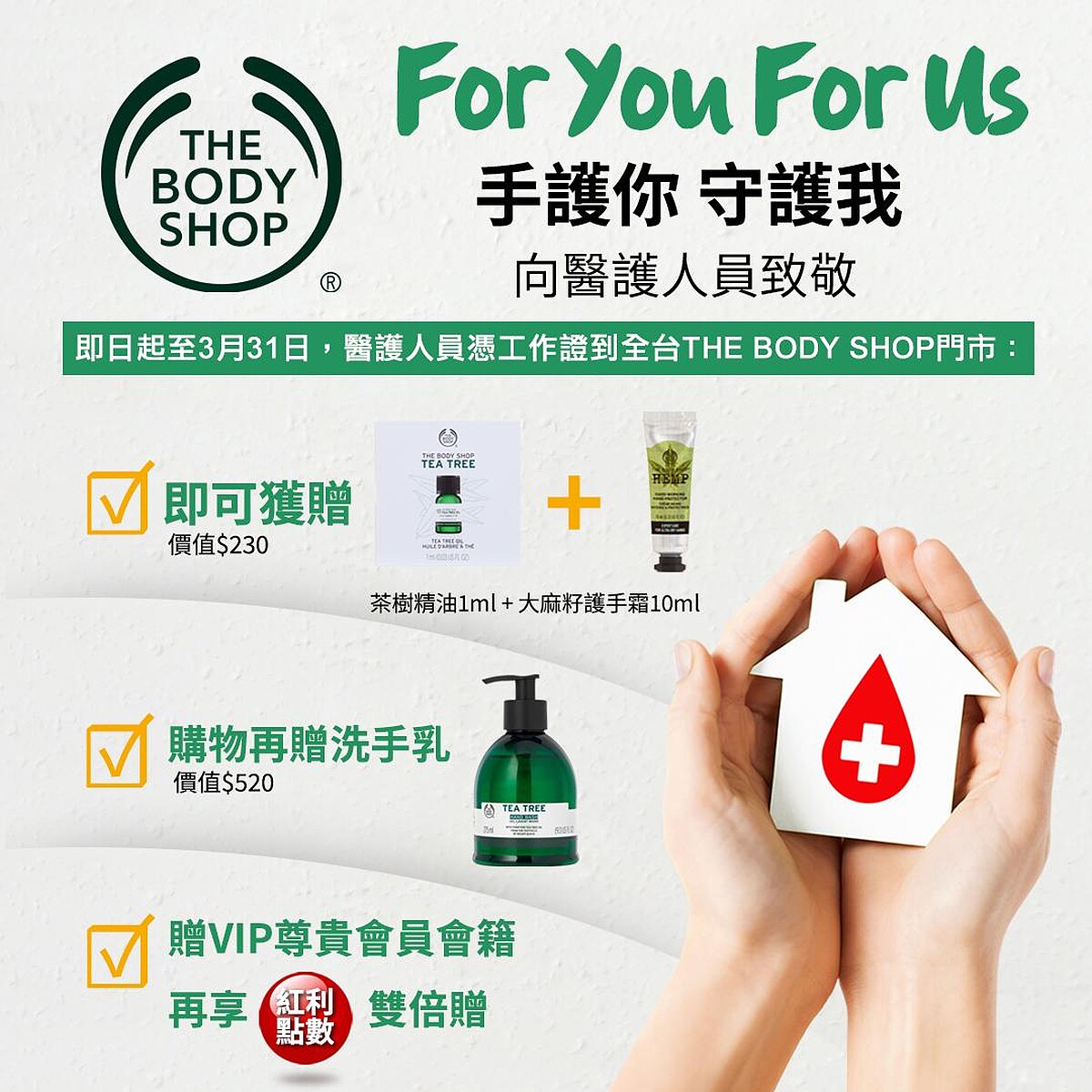 即日起至3月31日,醫護人員憑工作證到全台THE BODY SHOP門市: